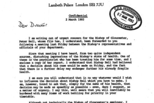 It was recently revealed that in 1993, when Ball was being investigated, Lord Carey wrote to the director of public prosecutions in support of the bishop. Ball was not prosecuted but merely cautioned, and resigned as Bishop of Gloucester.