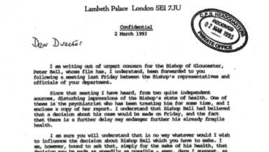 While he was in office, in 1993, Lord Carey wrote to police in support of Bishop Peter Ball, now serving a prison sentence for sex abuse.
