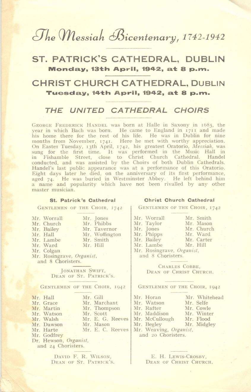 Scores of the oratorio in the Christ Church music books indicate how the work was subsequently absorbed into its choral repertoires, while surviving orders of service and related concert programmes in the St Patrick's cathedral collection of records, reveal, for example, that two celebratory Messiah bicentenary concerts were held in 1942 given by members of the united cathedral choirs at successive performances of the work – the first in St Patrick's cathedral on Monday 13 April, and the second in Christ Church cathedral on Tuesday 14 April 1942. In the commemorative programme pictured below the names of choir members in both 1742 and 1942 are recorded.