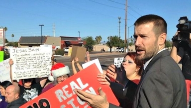 Steven Anderson addresses demonstrators protesting outside Faithful Word Baptist Church on Sunday 7 December. Ryan Van Velzer