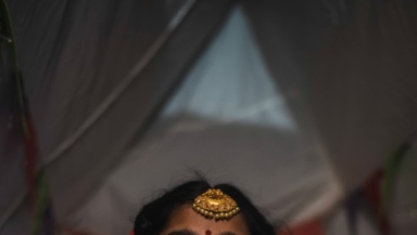 Tisha gazes blankly at the camera with kohl-lined eyes. She is veiled in silken red fabric and festooned with golden jewelry. Her lips are painted red, her young cheeks a delicate pink. Her skirt trails clumsily after her. It's too long. It was made for an older woman.