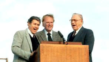 Shea (right) with Billy Graham (centre) and Cliff Barrows (left), music director at the Billy Graham Evangelistic Association