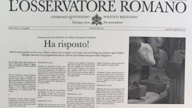 The front page mock-up contains a fake reply, purportedly by the Pope, to the cardinals who have criticised his exhortation Amoris Laetitia. Conservatives are angry because the document, the result of two synods on the family in Rome, appears to permit a liberalisation of the current ban on communion for Catholics who have remarried after divorce.