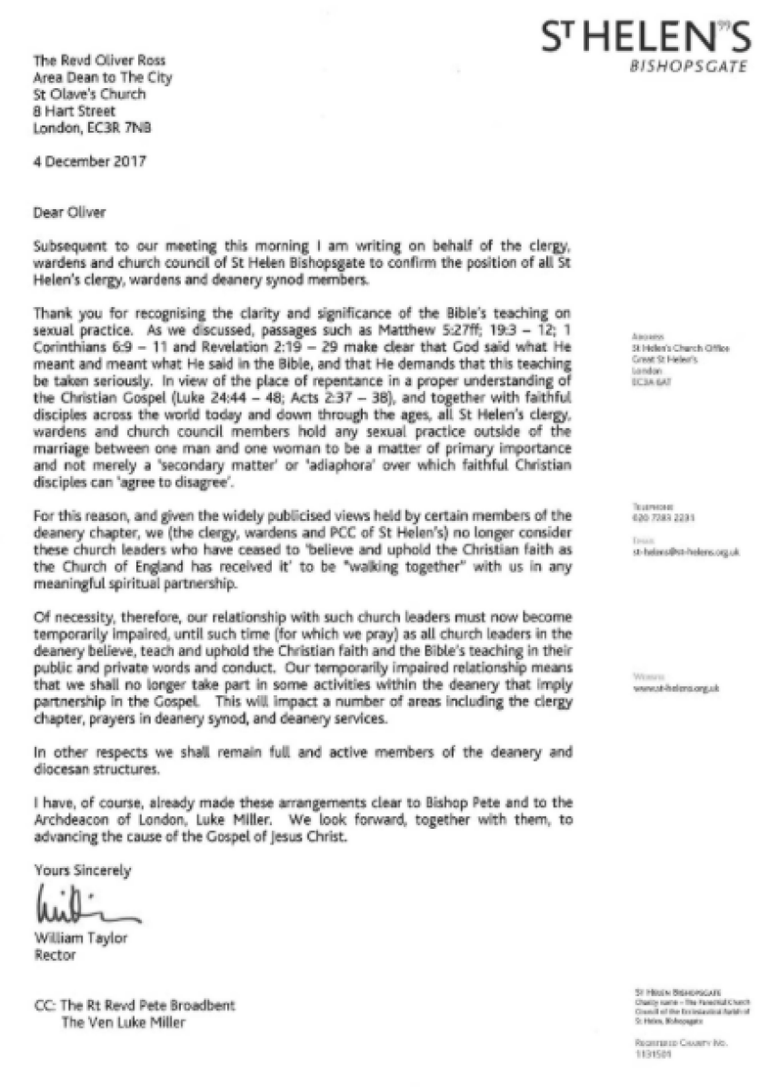 Taylor said the previous Bishop of London, Richard Chartres', willingness to describe sexual relationships outside marriage between one man and one woman as sinful meant St Helen's could work with other Anglican churches around London.