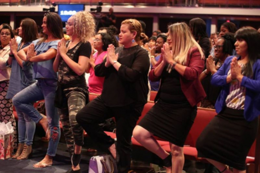 Women at Potter's House Dallas engage in yoga exercises on Aug. 4, 2018. (Instagram/SeritaJakes)