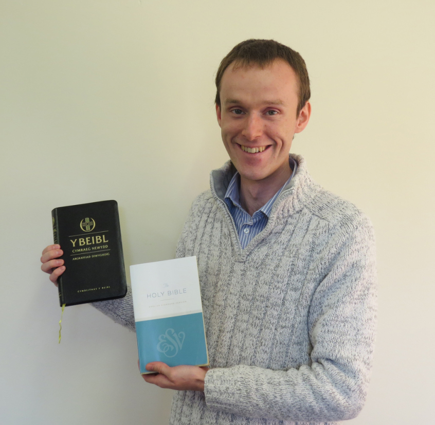 Carwyn with Welsh and English translations of the Bible (Photo: Wycliffe Bible Translators)