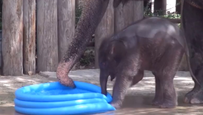 Baby elephant in pool VIDEO: Adorable elephant amuses crowds as it splashes into inflatable pool