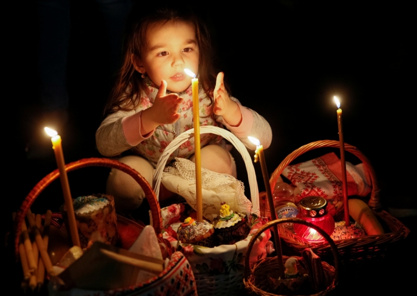 A girl plays with a candle on the eve of the Orthodox Easter service, outside the Volodymysky Cathedral in Kiev, Ukraine.