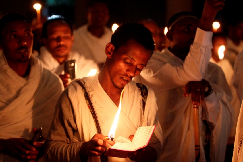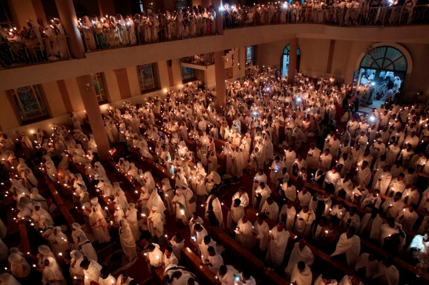 Ethiopian Orthodox faithful hold burning candles as they attend the Easter eve prayer session inside the Medhane-Alem Orthodox Church at Ethiopia's capital Addis Ababa.