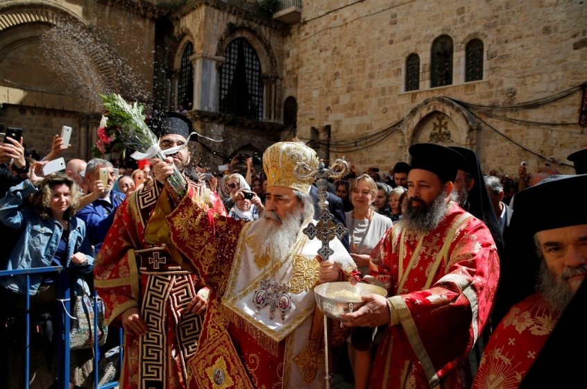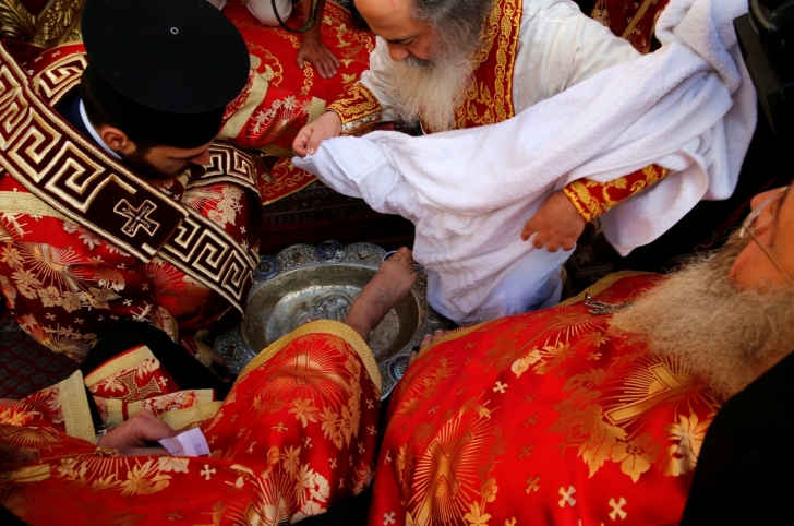 Greek Orthodox Patriarch of Jerusalem Metropolitan Theophilos blesses the crowd during the Washing of the Feet ceremony.