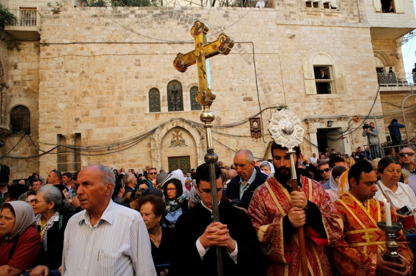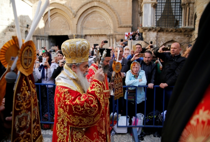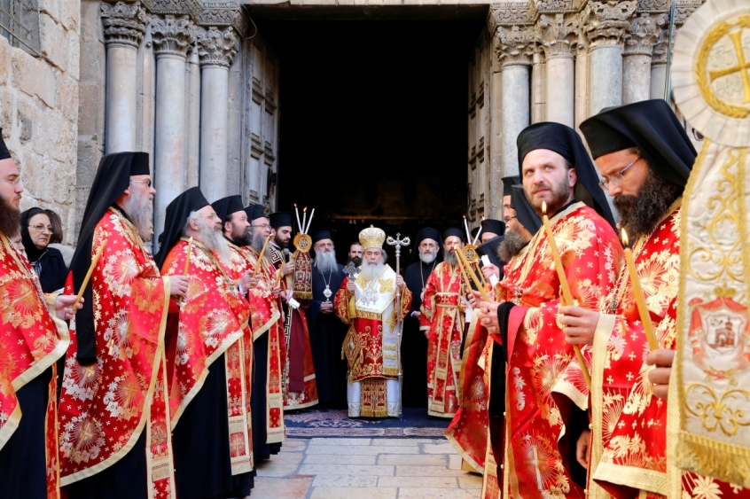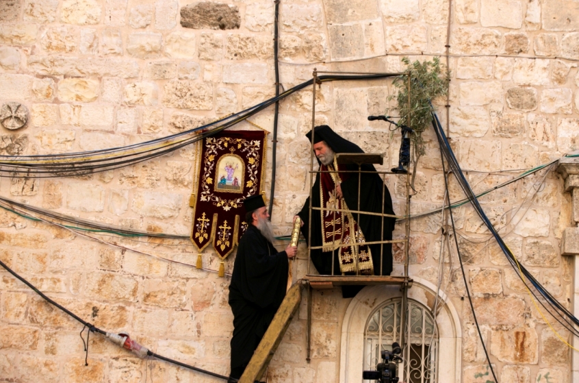Members of the Greek Orthodox clergy outside the Church of the Holy Sepulchre.