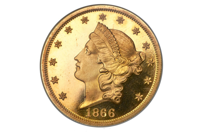 'According to United States Mint records, only 30 proof Liberty double eagles were struck in 1866,' Miller explained. 'Today we can track only 10 known surviving specimens, and three of them are part of permanent collections, including one in The Smithsonian Institution. The In God We Trust motto first appeared on US coins in 1864, starting with copper two-cent denomination coins, and was used on $20 denomination gold coins starting in 1866.'