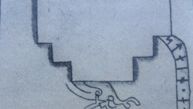 The 1.8 metre stone was found by chance when a trench was dug on the site of the demolished church. Although damaged, parts of the inscription and ornamentation are still visible. The carving begins and ends with the head and tail of a monster-like creature.
