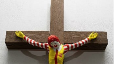 The artwork depicts a crucified Ronald McDonald. According to police, protesters tried to force their way into the museum and some officers were injured when rocks were thrown. A Molotov cocktail was thrown on Thursday.