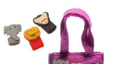 What's not to like about this adorable felt bag made in Nepal? Not only can kids use it to store their treasures or pocket money when they're out with mum and dad, they can play fill any dull moments with the elephant, lion and monkey finger puppets.
