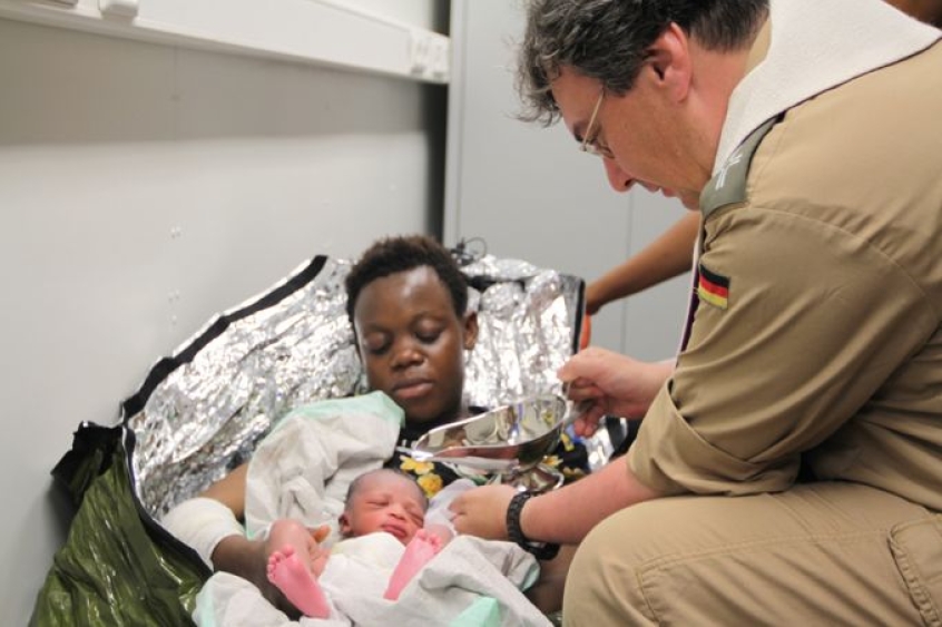 Along with the ship's medical team, its military chaplain, Fr Jochen Folz, had offered his assistance to the new mum as soon as he discovered that she had given birth on board.