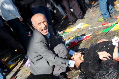 Bodies covered by flags and banners, including those of the pro-Kurdish opposition Peoples' Democratic Party (HDP), lay scattered on the road among bloodstains and body parts.