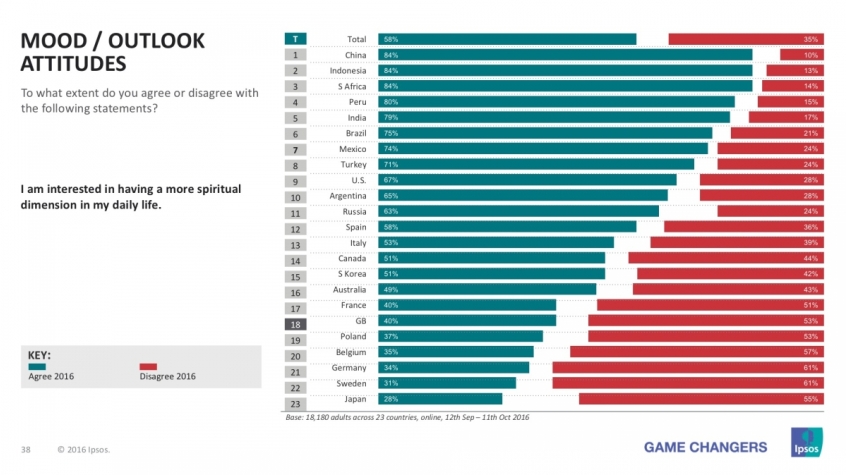 It highlighted that only 40 per cent of Britons said they were interested in having a more spiritual dimension to their lives with only Poland, Belgium, Germany, Sweden and Japan having a lower rate of interest.