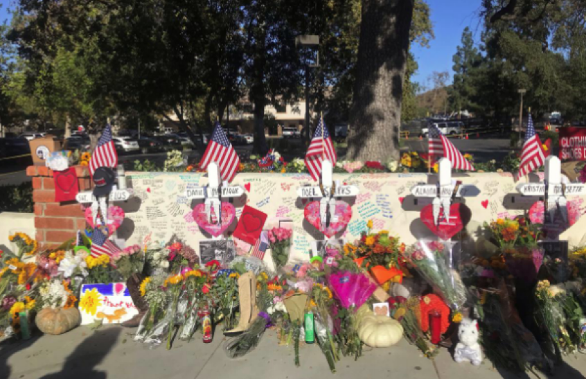 Mourners returned on Monday to the scene of a shooting rampage at a bar in the Los Angeles suburb of Thousand Oaks, where a Chicago-area carpenter erected wooden crosses dedicated to each of the 12 victims.