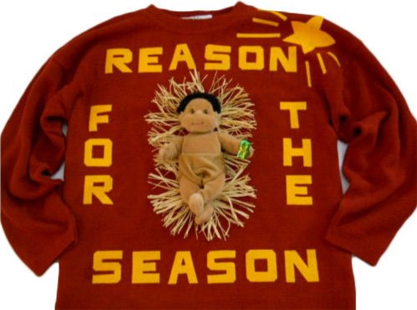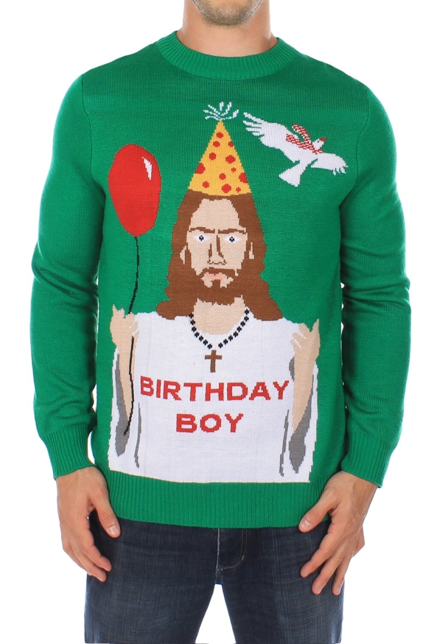 There's actually a surprising number of designs which offer a corrective on the true historical significance of Christmas (if you ignore the fact that is almost certainly wasn't his actual birthday). Jesus is variously pictured with cakes, candles, and thumbs up. Wear this to parties and reinforce everyone's opinion of you as a religiously overbearing killjoy!