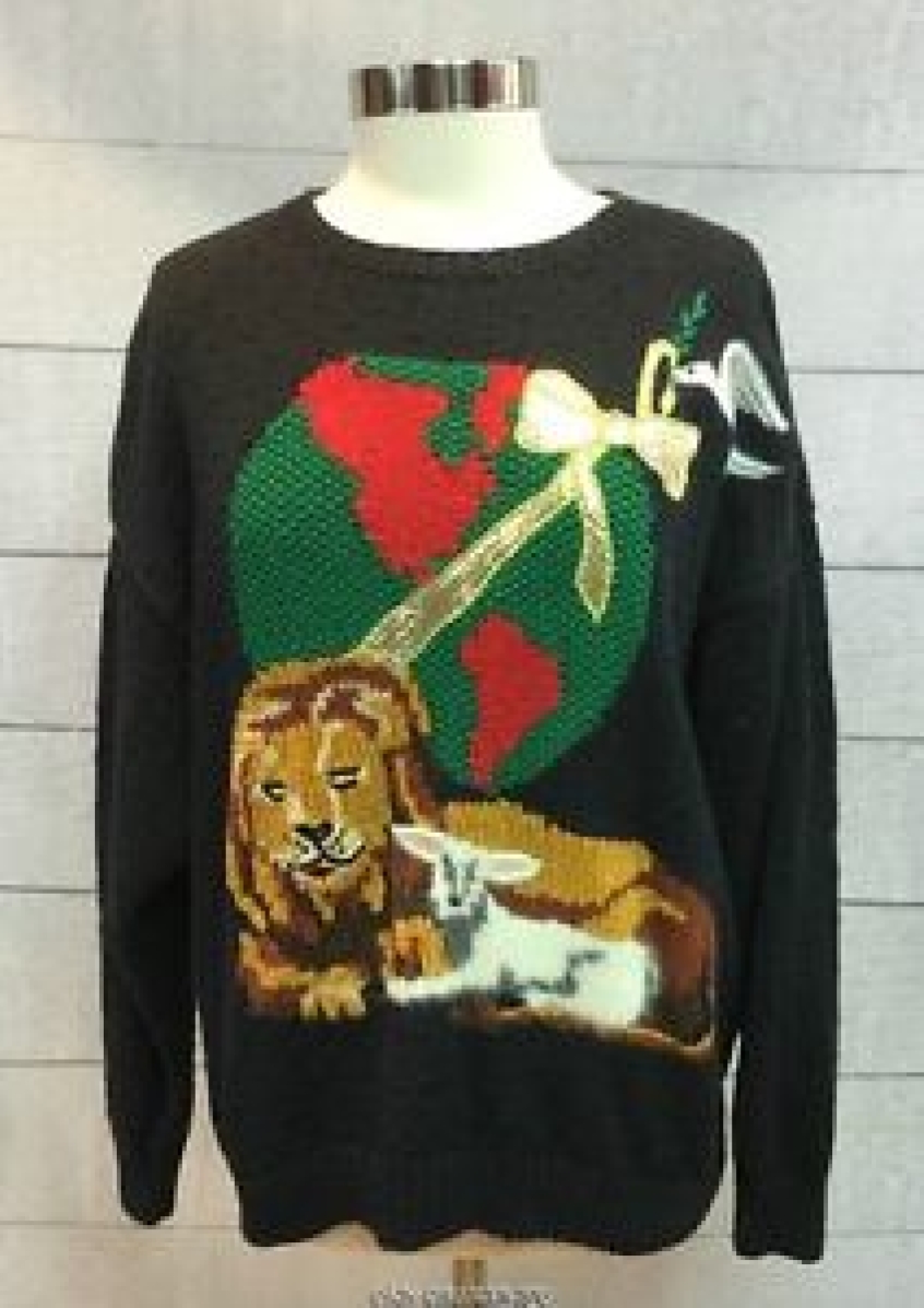 Perhaps my favourite of the lot - this jumper only really works if you know the Scriptural reference about the Lion laying down with the Lamb. And if you do, you're a better scholar than me, because I can't actually find it in the Bible. Isaiah 11 v 6 puts a wolf and a lamb together alongside a leopard and a kid, while 65 v 25 of the same book has a lion eating like a bullock. But the Lion and the Lamb are actually only found together in a Chris Tomlin song. So it's a cute jumper, but it also promotes Biblical illiteracy.