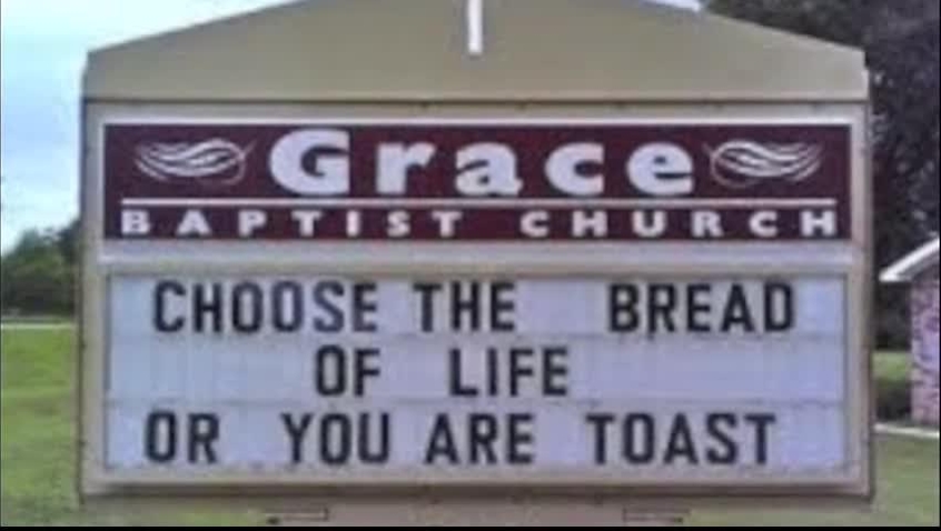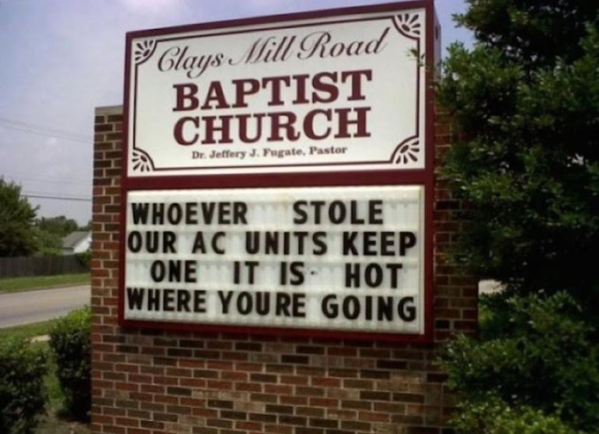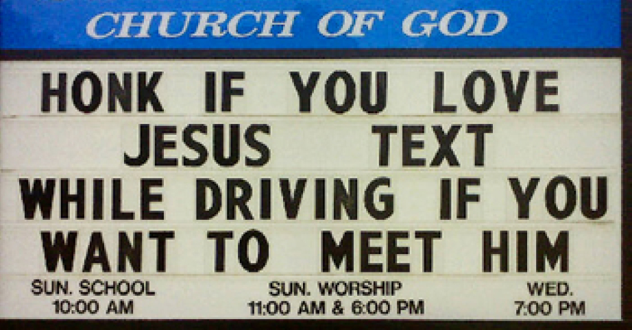 This popular message has sprung up on church signs across America from time to time, and actually creates a useful practical application for the board. Impressively though, it still manages to squeeze in a reference to eternal consequence AND make a joke at the same time. Ironically, driving by and laughing at this sign could theoretically be the catalyst for a fatal car accident.