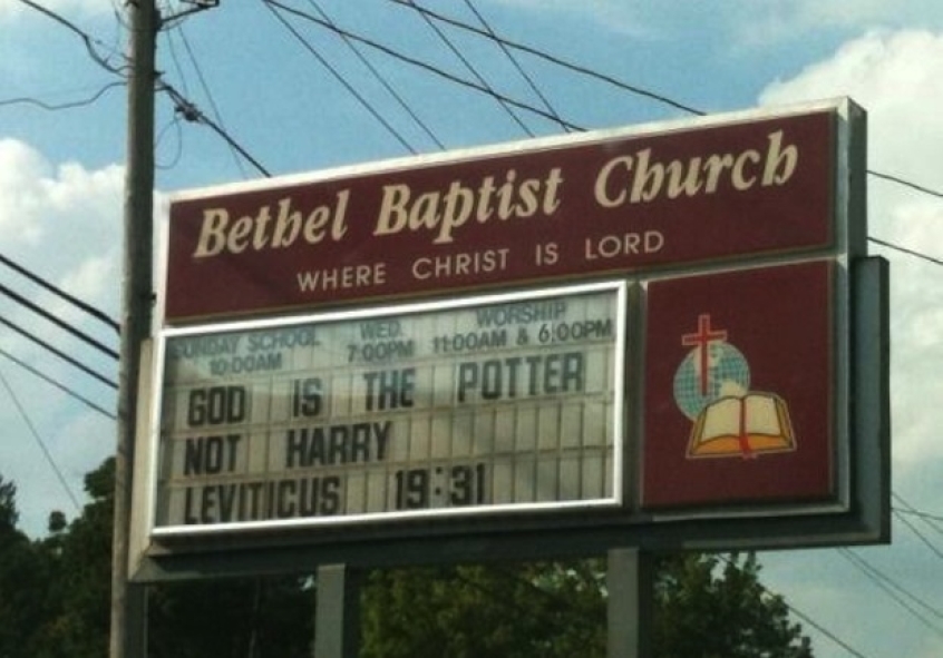 Another important function of the church sign is to demonstrate that the minister is up with the times. More recent signs have made reference to catching Pokemon and the trinity-illustrating fidget spinner, but this one comes from a time when it was super-cool to name check the boy wizard, even when you thought he was a gateway to the demonic. It's from 2015.
