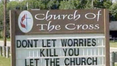 As any comedian will tell you, there's nothing as painful as dying on stage. The author of this almost-there witticism demonstrates that it's also possible to die on a church sign. Too clever. And yet at the same time, not quite clever enough.