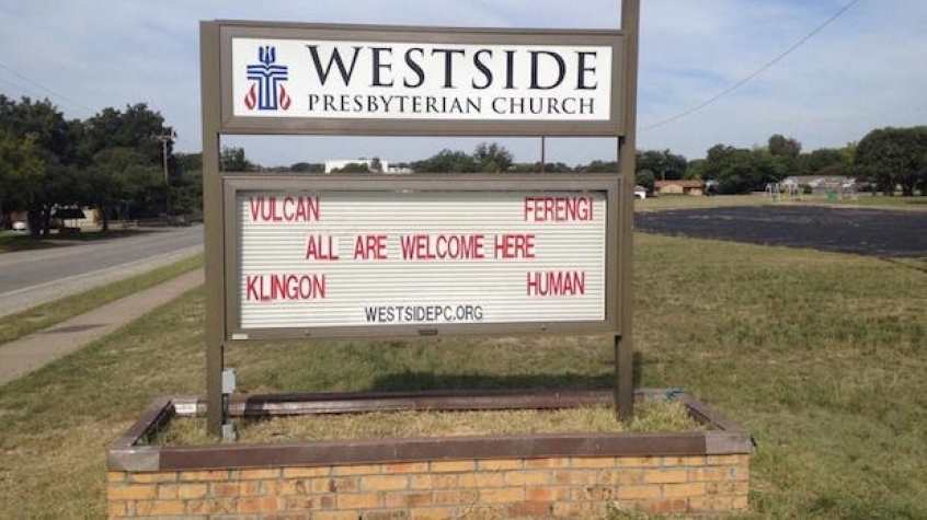 This church almost certainly has a Trekkie pastor, or otherwise a very autonomous Trekkie sign writer. Either way, while this might appeal to people who know what 'Ferengi' are, it otherwise makes the church feel like a strange place full of weirdos with unusual interests. And let's face it, most churches don't need any help with that.