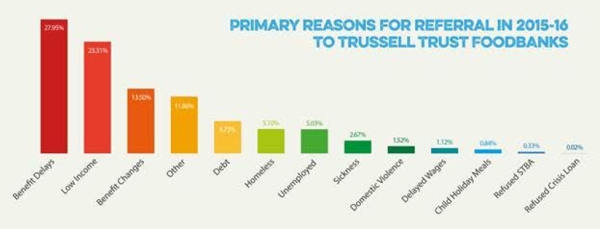 Ninety-three per cent of foodbanks reported "administrative delays in benefit payments" as an issue driving food bank usage.