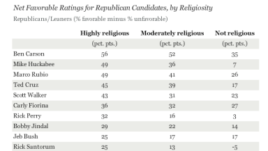 "No sign here of any special appeal on the part of Trump to highly religious Republicans," says Frank Newport in his Gallup opinion piece, noting that Carson's 56-point net favorable among the highly religious Republicans is more than two-and-a-half times higher than Trump's. Huckabee, a former Southern Baptist minister, is the most skewed toward the highly religious Republicans of any of the candidates.