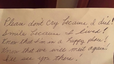 "Please don't cry because I died!" the note read. "Smile because I lived! Know that I'm in a happy place! Know that we will meet again! I'll see you there!"