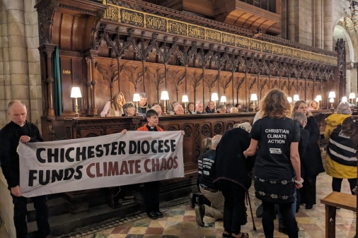 In addition to its cathedral protest, CCA has sent a letter to the Bishop of Chichester, saying, "We feel compelled to make it plain that Chichester Diocese is supporting the greenwashing of Total, Shell and BP, and is complicit in the suffering of millions of people in the global south and the breakdown of the earth's life support systems."