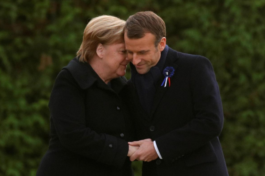 In a powerful show of unity, Macron and Merkel sat inside the reconstructed teak-lined rail wagon in which the peace charter was signed and looked through a book of remembrance. After each signed the book, they held hands a second time.