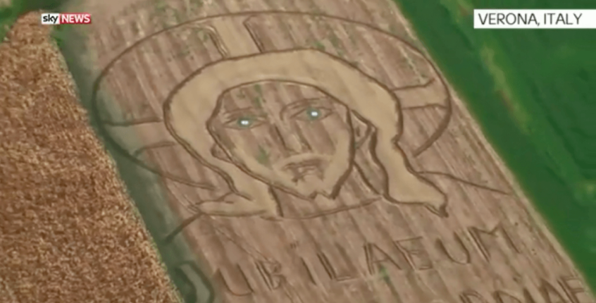 Gambarin created a 24,000-square-meter image of Jesus Christ using a tractor and a rotating harrow and a plough in a field near Castagnaro, in the province of Verona, Italy, according to Sky News. To bring to life the eyes of the Saviour, Gambarin used white spray paint and nylon cloth.