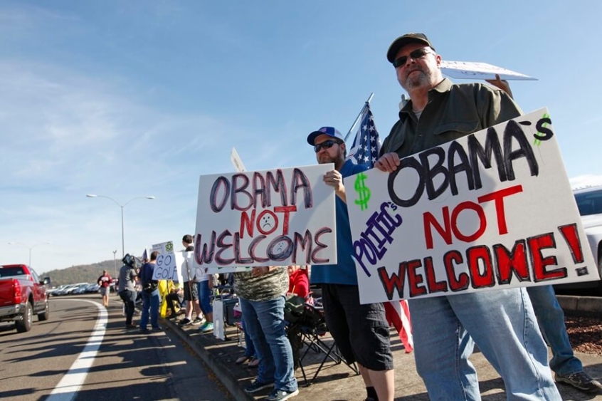 Gary Shambling, one of the protesters, said Obama should not have come to Oregon. "He should stay away," he said. "He made it very plain, 15 minutes after the shooting happened. He politicized it. The bodies weren't even cold."