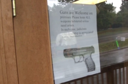 The sign, posted a month ago, reads: "Guns are Welcome on the premises. Please keep all weapons holstered unless need arises. In such case, judicious marksmanship is appreciated!"