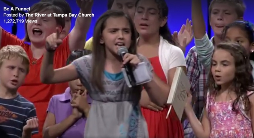 Titled "Be A Funnel," the video carries the message "Become like a little CHILD and just receive..." It shows the congregants, children and adults alike, exuberantly reacting with joy and being blessed with the Holy Spirit as the girl speaks.