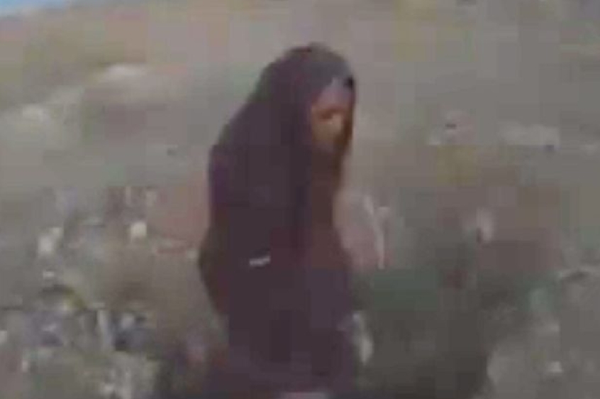 He is seen in the video disregarding her pleas for forgiveness. In the background, the black flag of the Islamic State can be seen.