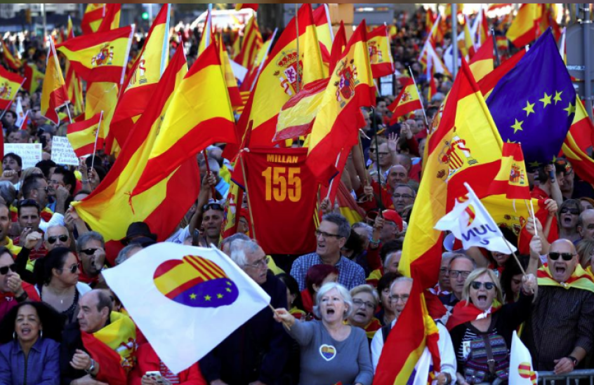 Waving thousands of Spanish flags and singing 'Viva España', protesters on Sunday turned out in the largest display of support for a united Spain since the beginning of the crisis -- underlining the depth of division in Catalonia itself.