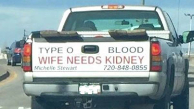 Bob Stewart posted a sign on the back of his pickup truck reading "Type O Blood, Wife Needs Kidney," and the response was overwhelming.