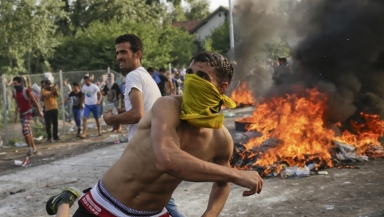 Helmeted riot police backed by armoured vehicles took up positions at the barricaded border crossing with Serbia, where male migrant youths pelted them with stones, demanding entry.