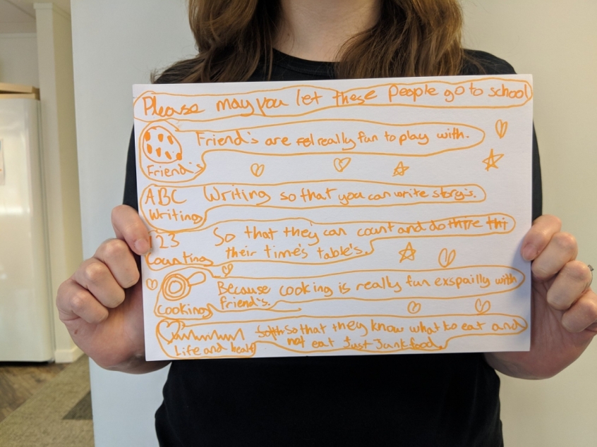 Impulso 18: Children need to go to school to develop socially. When they can't, they lose their friends, their language. It also makes it harder for them to have a career.