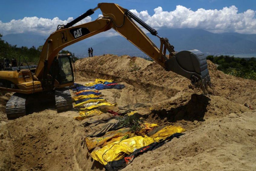 Elsewhere, on the outskirts of Palu, trucks brought 54 bodies to a mass grave dug in sandy soil.