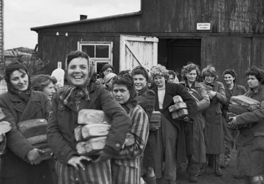 Cheerful women inmates collect their bread ration from one of the five camp cookhouses during the liberation of Bergen-Belsen concentration camp in Germany in April 1945. (Wikipedia/Imperial War Museum)