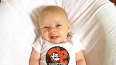 In the photo, Israel is wearing an Oklahoma State University (OSU) onesie. OSU is actually Derick's alma mater, and it was also where Derick's own father Rick Dillard went to college. During his college days, Rick was the school mascot Pistol Pete, so Derick decided to follow his father's footsteps and secretly try out as Pistol Pete.