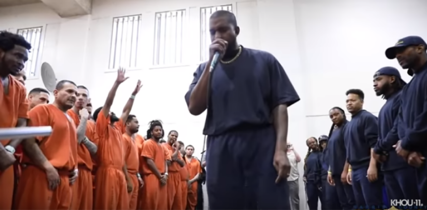 The rapper performed songs from his Jesus is King album for more than 200 men at the Harris County Jail in Houston, Texas, before walking through an underground tunnel system to perform another show for a smaller group of female inmates at the Baker Street Jail.