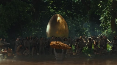 To the beat of drums in the background, the tribe continually carries and drops a giant golden egg before coming to a golden lake, which turns out to be a lake of gravy.