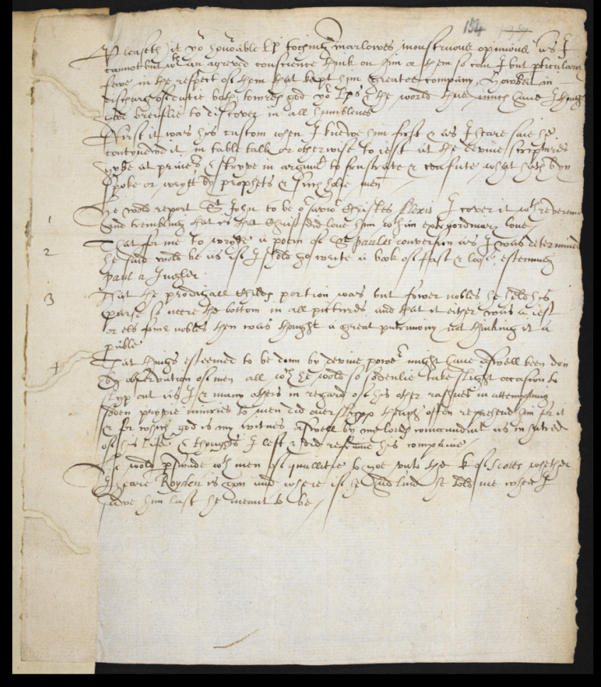 The scandalous so-called 'Baines note' reveals extraordinary details about the writer's private life. It claims to be a record of a conversation between police-insider and part-time spy Richard Baines and describes Marlowe's controversial and offensive views.
