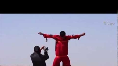 The man then appears with arms outstretched while hanging from a wooden pole.